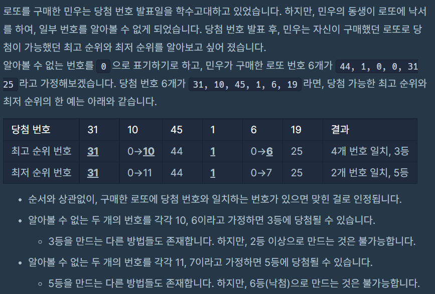 2. 0이 아닌 숫자들의 정답 개수를 확인한 후 0의 개수에 따라 최고 순위가 바뀐다. (최저 순위는 변동 X)