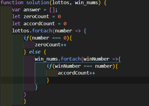 lottos 배열은 forEach 반복문을 돌면서 0이면 zeroCount 개수 올라가고