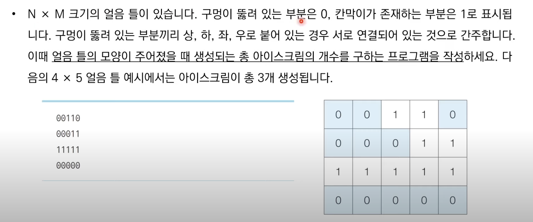 시작점인 [0,0]에서부터 인접한 노드들의 탐색을 시작한다. 그리고 탐색을 완료할 경우 1로 값을 변경하여 다시 탐색하지 않게 한다. [0,0]의 값을 1로 바꾸고 상하좌우 4개의 노드를 하나씩 살핀다. [0,1] 노드에 대해서 탐색을 시작하면 값을 1로 변경한 후에 다시 상하좌우 노드를 다 탐색한다. 위로 가면 틀을 벗어나고 좌우에 있는 노드들은 값이 1이므로 더이상 탐색할 필요가 없다. 그래서 아래쪽에 있는 [1,1] 노드만 탐색을 하고 값을 1로 변경한 후에 다시 그 노드를 기준 상하좌우를 탐색한다. 만약에 주변이 모두 1로 둘러쌓여있다면 이는 아이스크림의 경계선에 닿은 것이므로 덩어리 하나를 완성시킨 것이다.