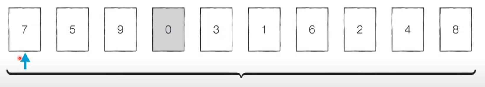 정렬(Sorting)은 말 그대로 데이터를 특정한 기준에 따라 순서대로 나열하는 것을 의미한다. 오름차순이라면 점점 커지게, 내림차순이라면 점점 작아지게 나열을 하도록 만들면 된다. 정렬 알고리즘은 정말 다양하게 존재한다. 아래의 알고리즘 설명은 모두 오름차순을 기준으로 설명한다. 1. 선택 정렬 (Selection Sort) 데이터 중에서 가장 작은 데이터를 선택해서 맨 앞에 있는 데이터와 바꾸는 것을 반복하는 알고리즘이다. 최솟값을 계속해서 앞으로 가져오는 걸 반복한다고 생각하면 이해가 더 쉽다. 처음에는 전체의 최솟값인 0과 7의 위치를 바꿔준다. 그 다음 맨 앞은 최솟값임을 확정지었으니 나머지 9개의 최솟값을 또 확정지어서 2번째 원소로 가져온다. 그래서 나머지 9개의 원소들 중 최솟값인 1을 5..