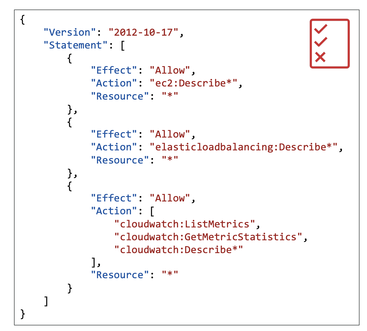 Statement 항목을 보면 ec2의 describe가 허용되어있고, elasticcloudbalancing의 describe가 허용되는 등 접근 가능한 기능들이 JSON 문서에 나와있습니다. 이렇게 유저별로 접근 권한을 부여할 수 있는데 이에 대해서는 한 가지 원칙이 있습니다. 사실 되게 당연한 거긴 한데 유저가 딱 필요한 서비스들에만 접근 권한을 부여하는 것입니다. 그 이상 그 이하도 아닌 딱 필요한 서비스들에만 접근 권한을 부여해주는 게 가장 좋습니다.