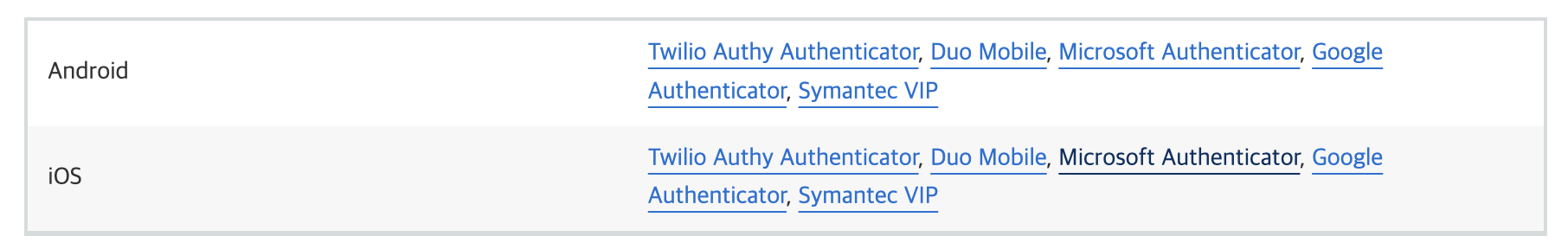 Google Authenticator, Authy 등 스마트폰에서 앱을 활용한 인증이 가능합니다. 아래와 같은 앱들을 지원하고 있으니 편한 걸로 사용하면 됩니다.