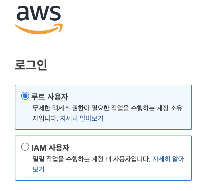 루트는 말 그대로 모든 권한을 가지고 있는 계정이고 회원가입을 하면 자동으로 생성됩니다. 그리고 IAM 사용자로 별도의 권한을 가진 계정으로도 로그인이 가능합니다.