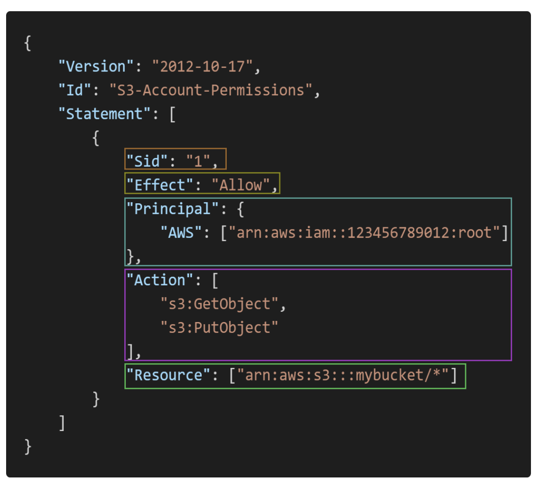 각각의 유저 또는 그룹은 정책 JSON 문서로 정의될 수 있습니다. 이 정책 문서는 유저별로 접근 권한을 나타내게 됩니다. 아래의 예시를 한 번 살펴보죠.