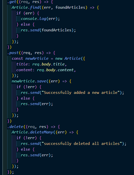 만약 '/articles'라는 경로에 대하여 get, post, delete 할 때 각기 다른 요청을 하고 싶다면 그냥 .get().post().delete()를 이어서 붙이면 됩니다.